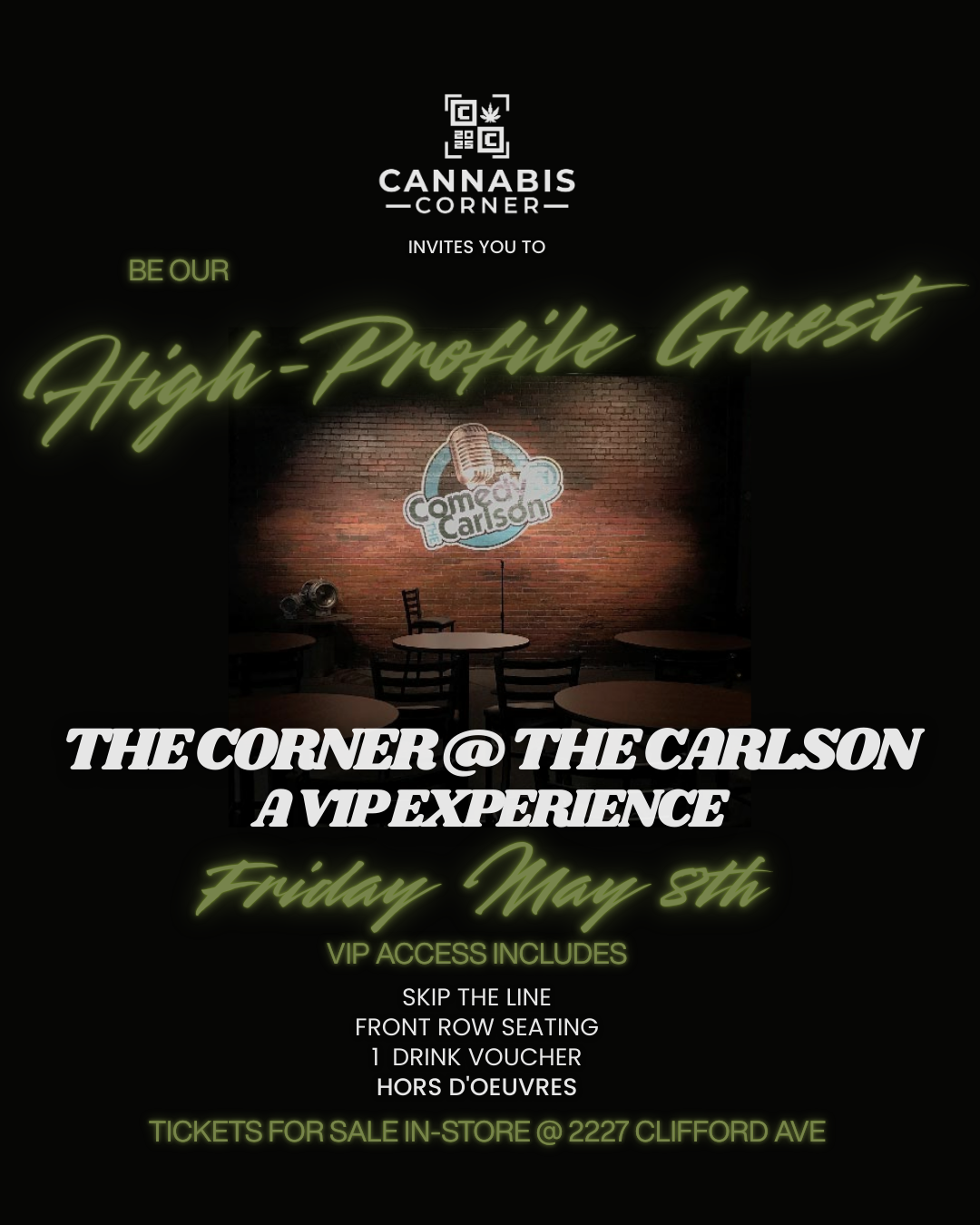 VIP passes are available in-store only at Cannabis Corner. For showtimes and additional details, please visit the Comedy at the Carlson website. Availability is limited.