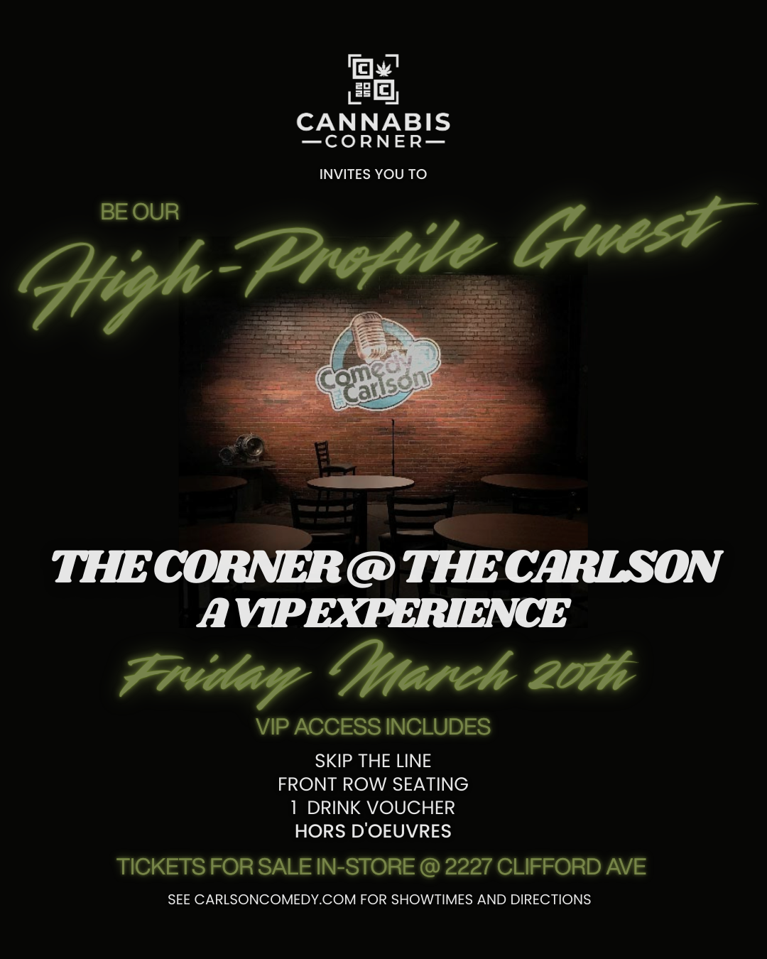 VIP passes are available in-store only at Cannabis Corner. For showtimes and additional details, please visit the Comedy at the Carlson website. Availability is limited.
